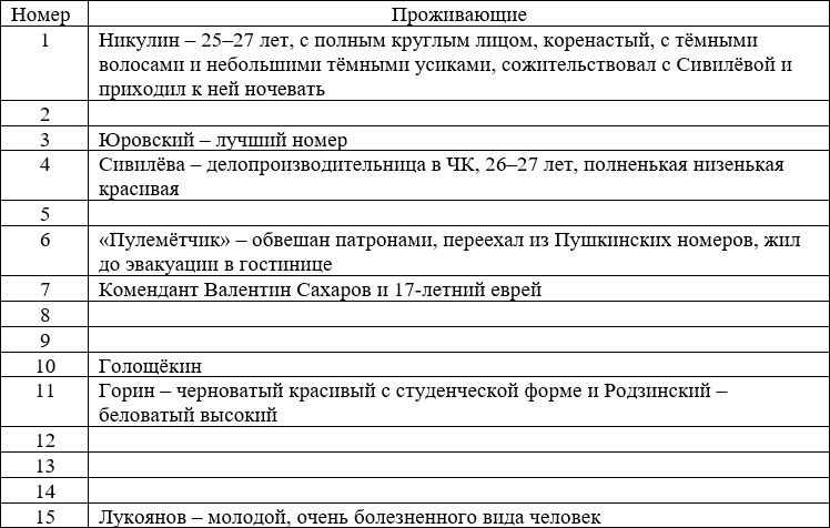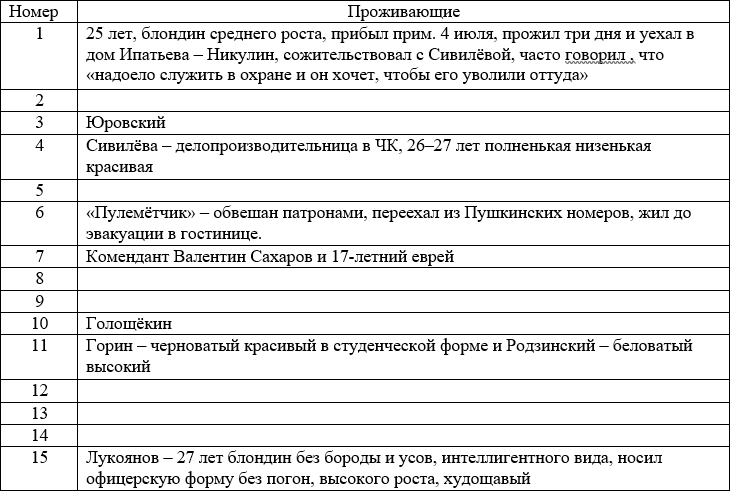 «… Комиссаров Белобородова, Чуцкаева и Сафарова я не знаю». Значит, они жили на квартирах, а не в этой гостинице. Юровский тоже жил в городе по адресу: г. Екатеринбург, ул. 1 Береговая, д. 6, но номер в гостинице был рабочим кабинетом.