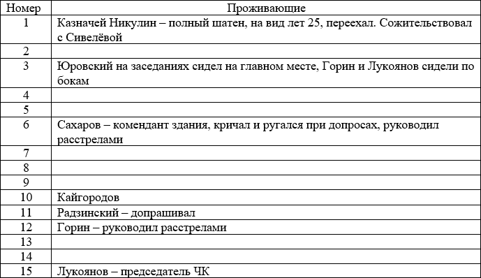 Интересно сравнить показания Пьянковой и Морозовой. Первая помоложе, у неё Горин – красивый, Морозова же постарше, она замечает, кто на заседаниях чекистов сидит во главе стола, а значит, кто настоящий начальник, и Горин у неё, несмотря на внешность, руководит расстрелами. Это снова подтверждает мысль о наборе большевиками зелёной молодёжи, не способной по неопытности оценить происходящие перемены в стране.