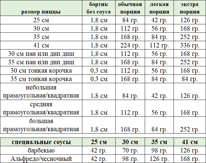 • Каковы значения порций соуса для нанесения на пиццы всех размеров?