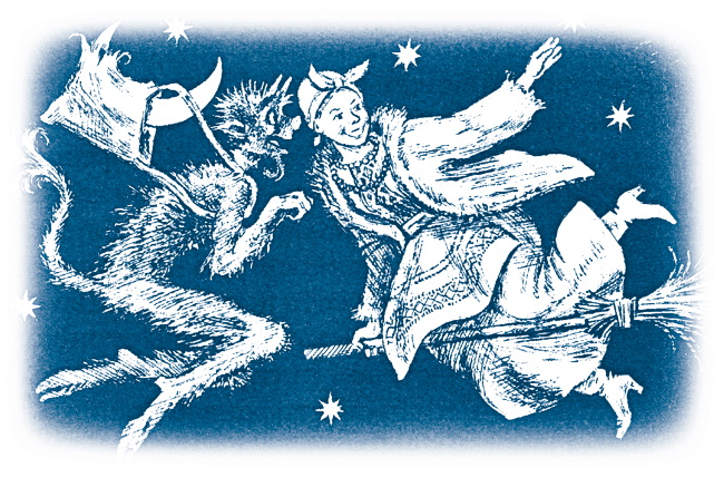 В русских сказках герой нередко нуждается в помощи нечистой силой, чтобы справиться с испытаниями. Баба-Яга вручает ему волшебный клубок, указывающий единственную надежную и верную дорогу. Черт в повести «Ночь перед Рождеством» помогает кузнецу Вакуле слетать в столицу к императрице. Писатель не стремился наводить ужас на своих читателей. Здесь заметен иронический тон по отношению к чертовщине, которой переполнены народные предания. Он как бы жалеет неприкаянные потусторонние силы: «Мороз увеличился и вверху так сделалось холодно, что черт перепрыгивал с одного копытца на другое и дул себе в кулак, желая сколько-нибудь отогреть мерзнувшие руки. Не мудрено, однако ж, и смерзнуть тому, кто толкался от утра до утра в аду, где, как известно, не так холодно, как у нас зимою, и где, надевши колпак и ставши перед очагом, будто в самом деле кухмистер, поджаривал он грешников с таким удовольствием, с каким обыкновенно баба жарит на Рождество колбасу».