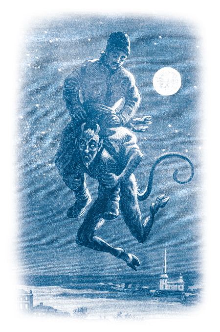 Настало утро. Вся церковь еще до света была полна народа. Пожилые женщины в белых намитках, в белых суконных свитках набожно крестились у самого входа церковного. Дворянки в зеленых и желтых кофтах, а иные даже в синих кунтушах с золотыми назади усами, стояли впереди их. Дивчата, у которых на головах намотана была целая лавка лент, а на шее монист, крестов и дукатов, старались пробраться еще ближе к иконостасу. Но впереди всех стояли дворяне и простые мужики с усами, с чубами, с толстыми шеями и только что выбритыми подбородками, все большею частию в кобеняках, из-под которых выказывалась белая, а у иных и синяя свитка. На всех лицах, куда ни взглянь, виден был праздник. Голова облизывался, воображая, как он разговеется колбасою; дивчата помышляли о том, как они будут ковзаться с хлопцами на льду; старухи усерднее, нежели когда-либо, шептали молитвы. По всей церкви слышно было, как козак Свербыгуз клал поклоны. Одна только Оксана стояла как будто не своя: молилась и не молилась. На сердце у нее столпилось столько разных чувств, одно другого досаднее, одно другого печальнее, что лицо ее выражало одно только сильное смущение; слезы дрожали на глазах. Дивчата не могли понять этому причины и не подозревали, чтобы виною был кузнец. Однако ж не одна Оксана была занята кузнецом. Все миряне заметили, что праздник – как будто не праздник; что как будто все чего-то недостает. Как на беду, дьяк после путешествия в мешке охрип и дребезжал едва слышным голосом; правда, приезжий певчий славно брал баса, но куда бы лучше, если бы и кузнец был, который всегда, бывало, как только пели «Отче наш» или «Иже херувимы», всходил на крылос и выводил оттуда тем же самым напевом, каким поют и в Полтаве. К тому же он один исправлял должность церковного титара. Уже отошла заутреня; после заутрени отошла обедня… куда ж это, в самом деле, запропастился кузнец?