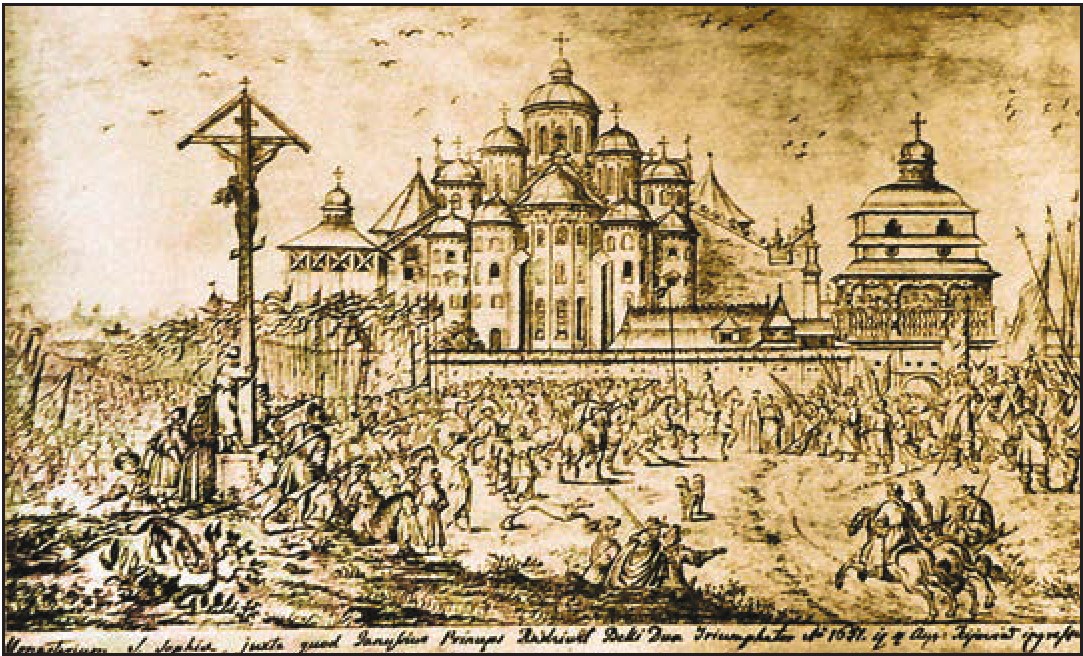 Софійський собор з дерев’яною дзвіницею (справа) на рисунку Абрахама ван Вестерфельда (1651)