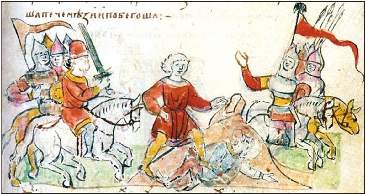 «В літо 1036, коли Ярослав перебував у Новгороді, прийшла до нього звістка, що печеніги взяли в облогу Київ. Ярослав же зібрав багато воїнів, прийшов до Києва і прорвався у місто своє. А було печенігів безліч. Ярослав виступив із Києва, приготувався до бою: варягів поставив посередині, а на правому крилі – киян, а на лівому крилі – новгородців…»