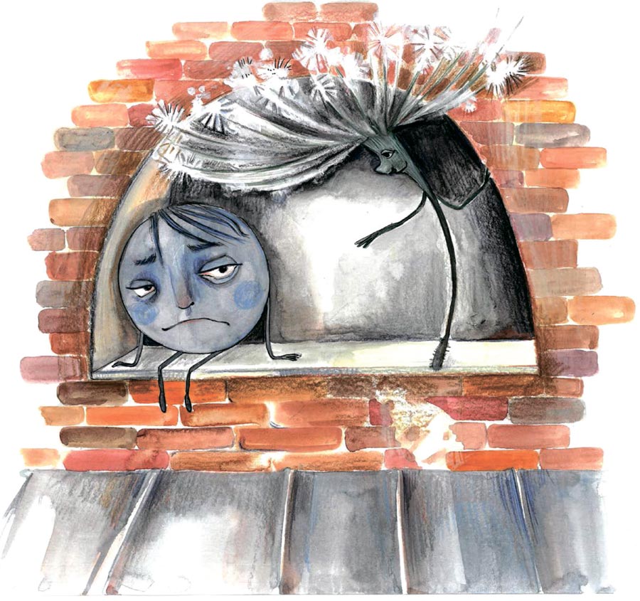 Зонтик огляделся и с удивлением отметил, что в этом доме не было дверей, а только одно окно, в которое он и залетел. И в этой мрачной каморке жил грустный Смайлик. «Интересно, он когда-нибудь улыбается?» – почему-то подумал Зонтик и спросил:
