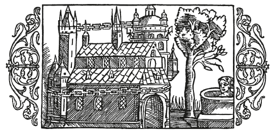 Изображение большого храма в Упсале. Можно различить приносимого в жертву человека в колодце. Из «Великой карты, или Описания северных народов» Олафа Магнуса (1555)