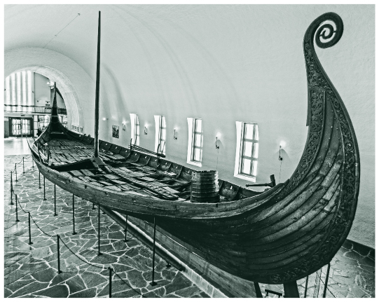 В 1903 году фермер из провинции Вестфолл, с юга Норвегии, обнаружил часть корабля, когда вскапывал поле. Следующим летом археологи из Университета Осло провели раскопки и извлекли огромную, украшенную резьбой ладью 21,5 метра в длину и пять метров в ширину. Корабль был изготовлен из дуба около 820 года н. э. и рассчитан на тридцать гребцов. В 834 году его вытащили на сушу и использовали для погребения двух явно знатных дам. Одной было около семидесяти – восьмидесяти лет, другой, вероятно, около пятидесяти. Они лежали вместе на кровати в великолепно украшенном домике, установленном позади мачты. Погребальная камера была выстелена роскошными коврами и богато обставлена мебелью, там найдены одежда, обувь, гребни, сани и изящно украшенное ведерко; все это разместили вокруг женщин. Обнаружены были и скелеты пятнадцати лошадей, шести собак и двух мелких коров. Поверх погребения был насыпан курган, но в позднее Средневековье его потревожили и, судя по всему, украли найденные металлические предметы. Более крупные и тяжелые ценные объекты остались на месте. Предполагают, что старшая из женщин могла быть королевой. Корабль из Осеберга, а также два других подобных ему можно увидеть в Музее кораблей викингов в Осло.
