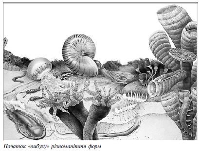 Близько 700 мільйонів років тому в океані з’явилися безхребетні тварини: кишковопорожнинні, анеліди, артроподи, безчерепашкові молюски, погонофори. Ще через 130 мільйонів років в океані стався справжній вибух нових видів. Виникло багато нових організмів: трилобіти, двостулкові та черевоногі молюски, хіоліти, брахіоподи із хітиновим скелетом, губки та корали.