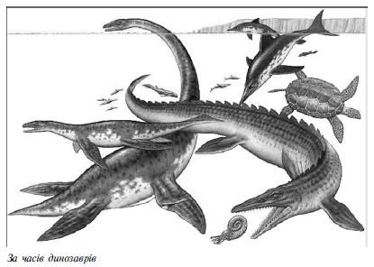 Наступні зміни у світовому океані, які сталися приблизно 230 млн років тому, пов’язані з динозаврами. Вони ще не остаточно порвали з морською стихією, тому більшість цих велетнів час від часу поверталася до води. Сушу засвоювали і прадавні амфібії (мастодонозаври), і рептилії (платеозаври, котласії, динозаври). У цей період одними з найстрашніших хижаків були гігантські крокодили – белодони. В морях також було чимало велетнів: іхтіозаври та плезіозаври. Ті мешканці підводного світу, які «народилися» раніше, продовжували розмножуватися та вдосконалюватися.