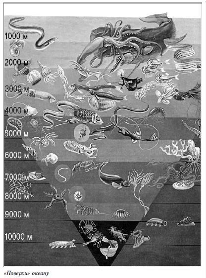 Океан – це великий дім із багатьма «поверхами». Його дахом є поверхня води – тоненька плівка, яка відокремлює наші світи. Найвищий поверх вдень майже прозорий. У ньому вирує життя: тут знаходиться дитячий садочок медуз та багатьох риб, у водній товщі плаває безліч невеликих рослинок та тваринок. На поверхні завжди багато гостей. З повітря на воду опускаються птахи, з глибини підіймаються дельфіни, щоб ковтнути повітря або погратися один з одним. Мешканці верхнього поверху живуть дуже неспокійно. Так, світла та кисню в воді багато, але і ворогів тут чимало, і живеш, як на гойдалці: вгору – вниз, вгору – вниз…