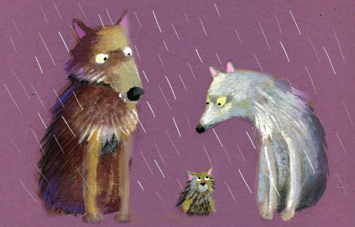 Триша удивился, он-то ведь был уверен, что таинственного гостя сопровождает целая стая грозных хищников. Но раз их всего только трое… Оленёнок осторожно выглянул из-под одеяла и увидел, что рядом с большим волком сидит ещё один, поменьше, зеленоглазый, с красивой тёмной мордочкой, а между ними сжался в комочек совсем крошечный мокрый волчонок. Малыш попытался встать, поскользнулся, шлёпнулся в лужу и жалобно заскулил. Зеленоглазая волчица – конечно же, это была его мама – помогла волчонку подняться.