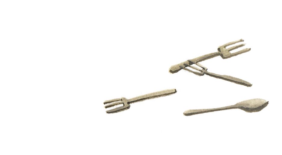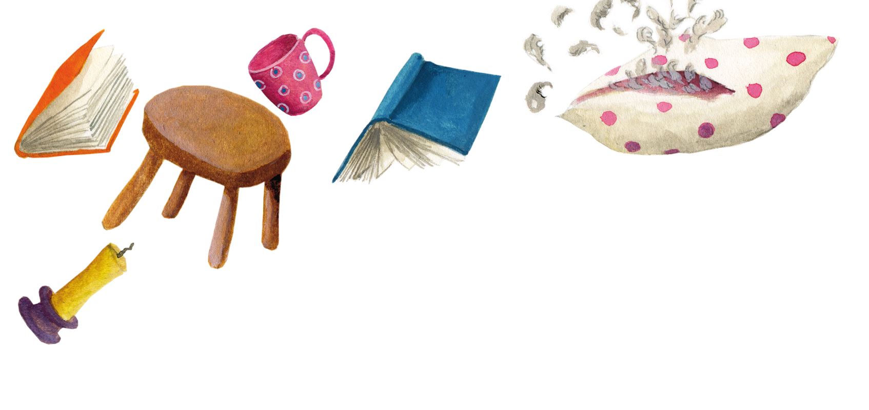 Оленёнок огляделся и увидел вокруг себя страшный беспорядок. В воздухе до сих пор носились перья, кружка разбилась, свечка растоптана. На полу рассыпана мука, а в ней валяются ножи, вилки и много чего ещё.