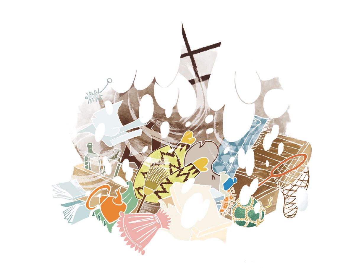 Хемуль падает на груду всякой всячины, которую муми-тролли стащили на чердак – до лучших времён или до весны.
