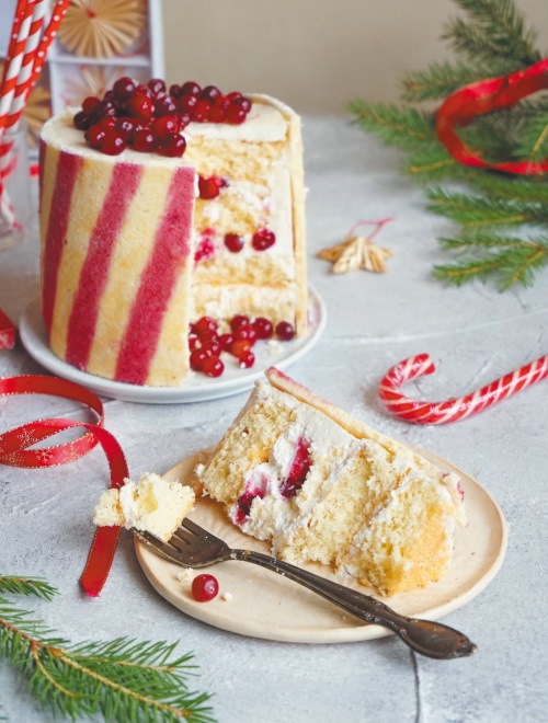 6. Готовый торт смазать тонким слоем охлажденного крема. Декоративный заварной бисквит нарезать на полоски высотой с прослоенный и обмазанный торт. Обернуть торт полосками заварного бисквита. Украсить свежей клюквой. Поместить торт в холодильник минимум на час перед подачей.