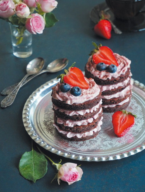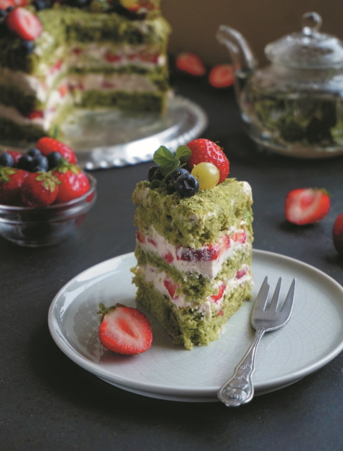 Шпинат не только придает красивый зеленый цвет этому торту, но и сохраняет все свои полезные свойства даже при термической обработке. Однако никакого вкуса шпината в готовом торте вы не почувствуете! Этот бисквит не требует пропитки, он достаточно влажный сам по себе. Удобнее всего использовать готовый замороженный шпинат (он уже помыт и разделен на порции). Если вы не планируете съесть торт в тот же день, то для начинки лучше не использовать свежие ягоды, а приготовить желе, как в рецепте на с. 45
