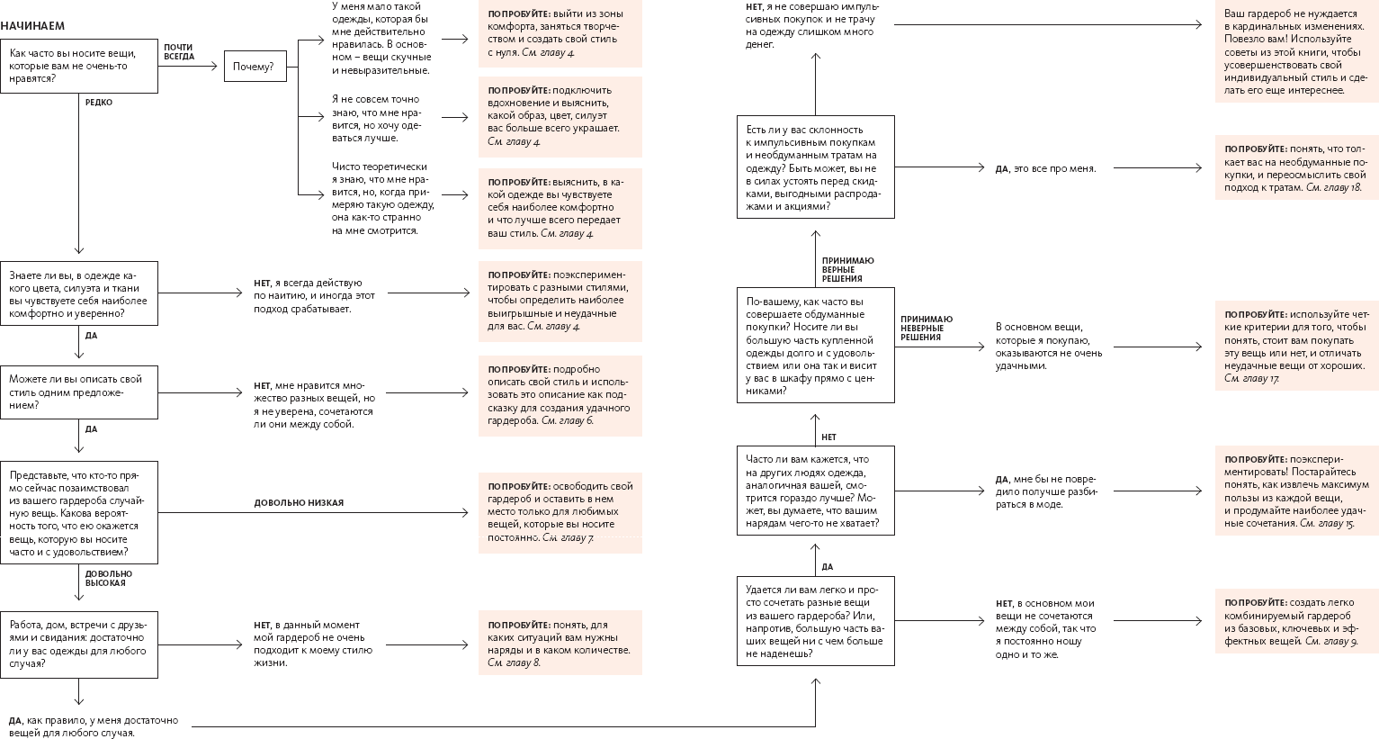 Нужно понимать, что идеальный гардероб за пару дней не составишь. На стиль влияет все: места, где мы побывали, люди, которых встретили. Наш стиль – это результат всех полученных нами впечатлений, и он беспрестанно меняется. Чтобы создать гардероб, соответствующий индивидуальному стилю, придется постараться и немало поломать голову. Но не переживайте: вообще-то это процесс очень интересный и увлекательный!
