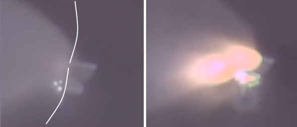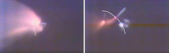 Сначала следует выброс яркого пламени, расширение которого тоже не характерно для высоты 45 километров. Аномальное расширение факела отсутствует. Белые линии, на кадре справа, указывают границы расширения факела, которое должно было быть при полете ракеты в сильно разряженной атмосфере. В полете STS-2 аналогично проявление работы водородных двигателей, если это только действительно водородные двигатели, хорошо видно. Это три светлых точки в хвостовой части шаттла. Конечно, факел от работы водородного двигателя, на большом расстоянии от шаттла увидеть невозможно. Хотя вблизи шаттла этот факел отлично наблюдается.