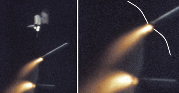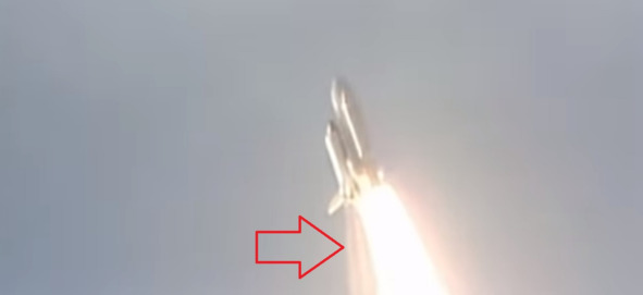 Хотя три белые точки в хвостовой части американского аппарата свидетельствуют о работе этих двигателей. В момент, предшествующий отделению боковых ускорителей, наблюдается на правом кадре яркое пламя из сопла двигателей. Будь это событие в условиях технического вакуума, начиная с высоты 40—45 километров, то, несомненно, расширение факела яркого пламени было бы значительно большего размера. Следующие кадры полета «шаттла» миссии STS-2 показывают аналогичную картину. [10] Если бы шаттл летел на высоте 45 километров, было бы расширение выброса газов из сопел РДТТ. Такая форма факела характерна для полета «космического» аппарата на высоте меньше официальной величины.