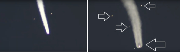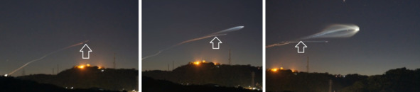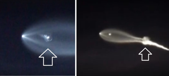 Образование «медузы» начинается у ракеты Маска с высоты, где прекращается образование инверсионного следа. Отмечено указателем на кадре справа. Эти отметины на небе отмечены стрелками указателями, на трех кадрах ниже.