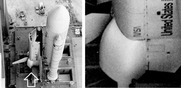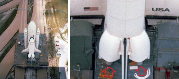 Подпись к фотографии НАСА: «S79—35236 (23 июля 1979 г.) – Орбитальный аппарат 101 „Шаттл“ „Энтерпрайз“ виден, когда он перемещается из площадки А, стартового комплекса 39». В хвостовой части установлены двигатели.