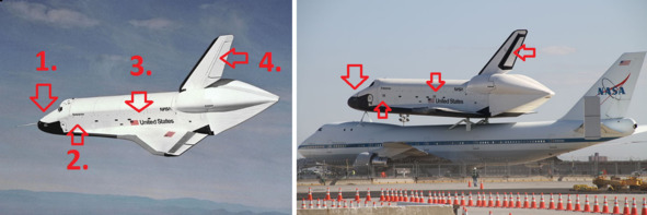 Необычность этих изображений в том, что американцы представили этот аппарат с таким названием в ином виде: «Энтерпрайз» прототип многоразового транспортного космического корабля «Спейс Шаттл», предназначенный для испытаний в атмосфере. «Энтерпрайз» был построен компанией «Rockwell International» и передан НАСА в январе 1977 года. Он не был предназначен для полётов в космос». В хвостовой части этого аппарата двигатели отсутствовали. Слева фотография НАСА: «Энтерпрайз» – испытательный полёт 13 сентября 1977». Справа фотография НАСА: Боинг-747 и шаттл «Энтерпрайз». Существует 4 очень заметных отличий между этими «Энтерппрайзами». 1. На шаттле слева полоски в носовой части нет, на шаттле справа она есть. 2. Под надписью «Энтерпрайз» на шаттле слева нет прямоугольной конструкции, на шаттле справа, на этом же месте она есть. 3. Над флагом США в верхней части справа на шаттле слева виден прямоугольник, на шаттле справа его нет. 4. Хвостовые части этих двух шаттлов с одним названием существенно различаются. Маловероятно, что эти фотографии являются зеркальными. Скорее всего, шаттлов было значительно больше, чем об этом заявляла официальная версия НАСА.