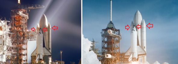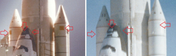 Фотография НАСА, слева, подпись: «S81—29212 (март 1981 г.). На этой ночной сцене, на стартовой площадке 39A, стоит освещенный космический челнок „Колумбия“. Его осветили прожекторы, поскольку ведется подготовка к первому полету (STS-1) новой многоразовой космической системы НАСА. Астронавты Джон В. Янг и Роберт Л. Криппен готовятся к полету. Фото предоставлено НАСА». [4] Фотография НАСА, справа, подпись: «S81—30498 (12 апреля 1981 г.) После шести лет молчания вновь слышен гром пилотируемого космического полета, поскольку успешный запуск первого космического челнока открывает новую концепцию использования космоса. Запуск 12 апреля 1981 года на площадке 39А, почти в 7 часов утра, приводит астронавта Джона Янга и Роберта Криппена к выполнению орбитальной задачи, которая продлится 54 часа и завершится посадкой на авиабазе Эдвардс в Калифорнии». [5] Отличия между этими конструкциями имеются, и они хорошо наблюдаются при сравнении снимков: 1. На фотографии слева имеется прямоугольник бежевого цвета на верхней части двух ускорителей. На фотографии справа, этот прямоугольник отсутствует на двух боковых ускорителях. 2. Справа на носовой части наблюдается светлое пятно на снимке 29212. На фотографии 30498 это пятно отсутствует. 3. На кадре 29212 три заглушки на двигателях поворота темные, на кадре 30498 заглушки светлые. Пора найти работника НАСА, который перепутал снимки!