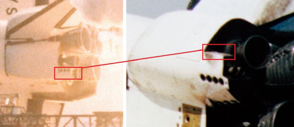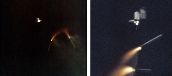 Фотографии НАСА, справа, подпись: «S81—33179 (12 апреля 1981 г.). Хотя их задание STS-1 было выполнено, два твердотопливных ракетных ускорителя (SRB) все еще светятся после того, как они покинули космический челнок „Колумбия“ на своем пути ко многим первым. Среди истории, зарегистрированной космическим кораблем, – маркировка миссии на космическом корабле многоразового использования. STS-1 – это первая пилотируемая миссия НАСА после экспериментального проекта „Аполлон-Союз“ в 1975 году». [13] Никакого аномального расширения факела не наблюдалось. Высота, на которой происходит отделение ускорителей ниже 45 км. Такой выброс газа, характерен для плотных слоев атмосферы.