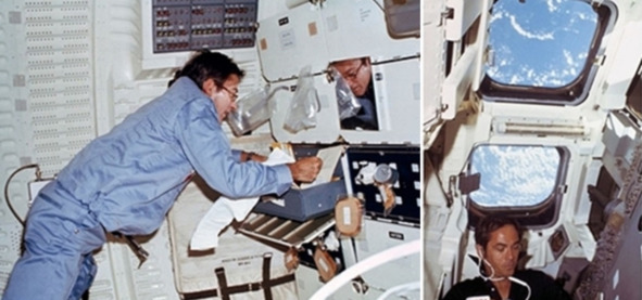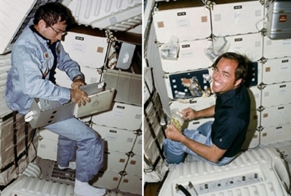 Фотографии НАСА изображают Янга (слева) и Криппена (справа) в сидячем положении. [16], [17] При желании в космосе, в состоянии невесомости можно принять такие положения тела, но характерно, что рядом с этими «космонавтами» не плавают предметы, а те вещи, которые у них в руках, прочно удерживаются. Все эти фотографии можно легко выполнить на Земле. Они не внушает особого оптимизма, в отношении реальности этого «полета». На сайте НАСА размещено всего шесть фотографий из космоса с участием Янга и Криппенга! Поразительная скромность со стороны американцев. Если учесть, что этот полет является началом нового этапа американской космонавтики, такая скромность не просто настораживает. По официальной версии это первый полет после перерыва в шесть лет со дня последнего пилотируемого «полета» программы «Союз-Аполлон». 12 апреля 1981 года разыгрывался какой-то один сюжет, из трех вариантов: