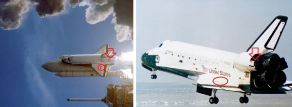 Подпись к фотографии НАСА, слева, повернута на 90 градусов влево: «S81—30459 (12 апреля 1981 г.) – Эта сцена была снята с удаленной камеры на стартовой площадке космического центра Кеннеди 39А, когда начался первый полет космического челнока „Колумбия“. Астронавты Джон У. Янг, командир STS-1, и Роберт Л. Криппен, пилот, находятся на борту „Колумбии“, поскольку она начинает орбитальную миссию, запланированную на 54 часа». [8] Подпись под фотографией НАСА, справа, приземление шаттла: «S81—30744 (14 апреля 1981 года) Задние колеса космического челнока „Колумбия“ собираются приземлиться на озере Роджерс (сухое русло) на базе ВВС Эдвардс в южной Калифорнии, чтобы успешно завершить пребывание в космосе через два дня. Астронавты Джон У. Янг, командир STS-1, и Роберт Л. Криппен, пилот, находятся на борту транспортного средства. Миссия ознаменовала первый полет НАСА, завершившийся посадкой на колесах, и представляет собой начало новой эры космических полетов». [9] Фотографии не зеркальные. На левом крыле флаг США на двух фотографиях. Увеличенные фрагменты указанных фотографий НАСА демонстрирует наличие трех отверстий рядом с хвостовой частью шаттла, на площадке слева на фотографиях НАСА 30459, 30499. Расположение этих отверстий на конкретном месте фиксируется на старте шаттла. Эти три отверстия на фотографиях 30459, 30499 на фрагментах фотографий выделены красным прямоугольником.