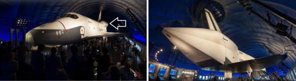 На фотографии слева эти отверстия видны, на фотографии справа на этом же месте указанных трех отверстий не видно. Можно найти оправдание тому, что на фрагменте справа не видны три отверстия. Можно, например, сослаться на плохое качество фотографии, засветку поверхности. Но, все равно, результат такого сравнения, вызывает нехорошие ассоциации к этому «полету». Но на этом чудеса преобразования аппаратов НАСА не заканчиваются. У «Энтерпрайза» в музее двигатели исчезают. Аннотация к фотографии, ниже, слева: «10 июля 2013 г. «Павильон космического шаттла» в музее «Бесстрашное море», авиации и космонавтики, в Нью-Йорке. Второй запуск космического челнока «Enterprise». [10] Подпись к фотографии справа: «Поскольку коммерческий космический полет становится все более правдоподобным, невероятно считать, что осталось только четыре шаттла НАСА. «Энтерпрайз», который сейчас находится в Музее «Бесстрашное море, воздух и космос», был прототипом шаттла, который начал космические исследования в 1977 году». [11] На стартовой площадке этот аппарат США в хвостовой части имел некое подобие ракетных двигателей. Можно, при желании, найти оправдание и такой ситуации. Самое простое: объявить подписи под снимками ошибочными. Можно сочинить и другие правдоподобные объяснения этим изменениям.