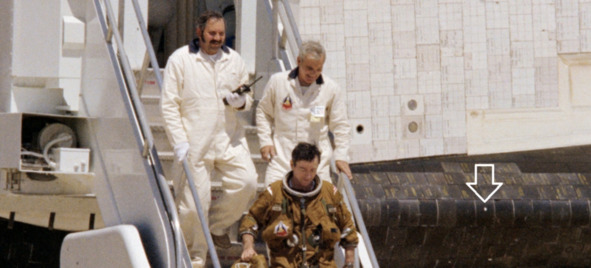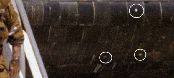 На фотографии изображен момент, когда Янг спускается по трапу, после завершения миссии STS-1. На снимке и фрагменте указаны светлые круглые пятна стрелкой и кружками.