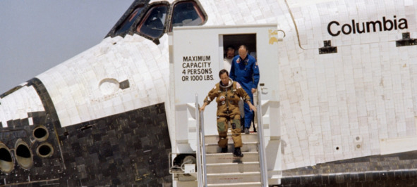 Описание фотографии НАСА: «S81—30843 (14 апреля 1981 года) – Астронавт Джон В. Янг, командир STS-1, выходит на орбиту космического челнока „Колумбия“ после ее успешной посадки на дне сухого озера Роджерс на базе ВВС Эдвардс в южной Калифорнии. К члену экипажа справа подходит доктор Крейг Л. Фишер, глава отделения медицинских операций». [20]