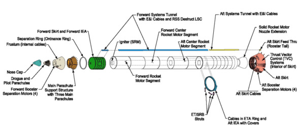 Каждый ускоритель имеет длину 45,5 метров, диаметр 3,7 метров и стартовую массу 580 000 кг, из которых около 499 000 кг составляет твёрдое топливо, а остальное приходится на конструкции ускорителя. Общая масса ускорителей составляет 60% всей массы космической системы. Каждый ускоритель имеет стартовую тягу (на уровне моря) приблизительно 12,45 МН (что в 1,8 раза больше, чем тяга двигателя F-1 использовавшегося в ракете Сатурн-5 для полётов на Луну и в 1,5 раза больше, чем самый мощный из когда-либо созданных ракетных двигателей на жидких компонентах топлива – РД-170), через 20 секунд после старта тяга вырастает до 13,8 МН (1400 тс)». [3]