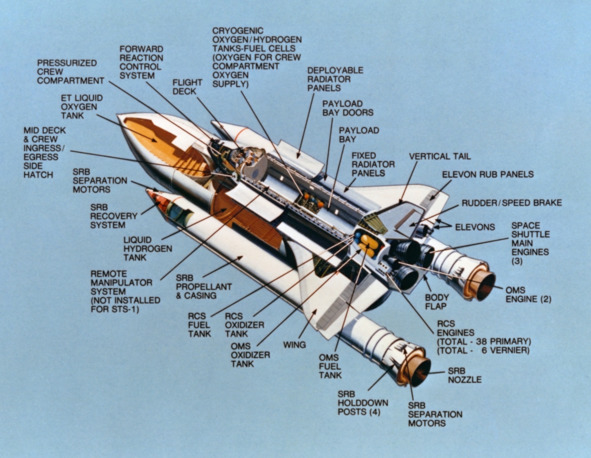 Сайт НАСА содержит общую схему конструкции «Спейс Шаттл» и описание основных характеристик: «S81—30630 (февраль 1981 г.). Концепция этого „выреза“ художника обладает некоторой художественной лицензией для раскрытия систем основных компонентов космического корабля. Здесь открыты двери отсека полезной нагрузки, видны криогенная станция снабжения челнока (примечание выреза) и развертываемые радиаторные панели (видимые). В действительности панели грузового отсека никогда не будут открыты, пока орбитальный аппарат прикреплен к твердотопливным ракетным ускорителям (SRB) и внешнему топливному баку (ET). Аэрокосмический летательный аппарат с толстым телом и дельтакрылом имеет длину 37 метров, пролет 24 метра (120 футов на 80 футов) и весит около 75 000 килограммов (165 000 фунтов). Его полезный отсек длиной 18,3 метра и 4. Диаметр 6 метров (60 футов на 15 футов) может доставлять одиночные или конгломератные полезные грузы высотой до 370 километров или меньшие грузы до 1110 километров (от 230 миль до 690 миль). Он может доставить полезные грузы в 14 515 кг (32 000 фунтов) обратно на Землю и может выполнять различные миссии продолжительностью от 7 до 30 дней». [1]