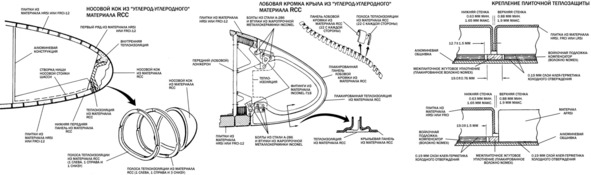 Что касается тепловой защиты, то максимальное значение температуры нагревание теплозащитных плит, на которое рассчитывали американцы, было подозрительно небольшим: «Теплозащита предназначена для поддержания температур обшивки не выше 450°К, стенок кабины экипажа – не выше 322°К, внутри ОПН – не выше 366°К, а в отсеках, где размещаются двигатели и шасси, – 450°К, хотя при входе в атмосферу отдельные участки наружной поверхности нагреваются до 1755°К. На различных участках корпуса в зависимости от степени нагрева при входе в атмосферу теплозащита выполнена из различных материалов». [12] Собственно описание ниже показывает, что американцы на самом деле применяли все ту же старую абляционную защиту, только в этот раз ее просто так не называли: «Нос фюзеляжа и передние кромки крыльев, нагревающиеся до 1755ºК, защищают теплозащитой RCC («углерод-углерод»), представляющей собой многослойную конструкцию из углеродной ткани, пропитанной фенольной смолой. Конструкция наиболее теплонагруженных элементов показана на схеме: