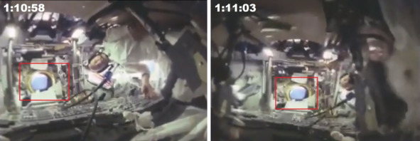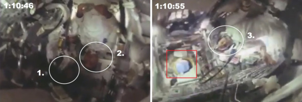 После этого эпизода оператор с изображения двух фигур повернул камеру на третьего члена экипажа. Цифрами отмечены «космонавты», никто из них не держал кинокамеру.