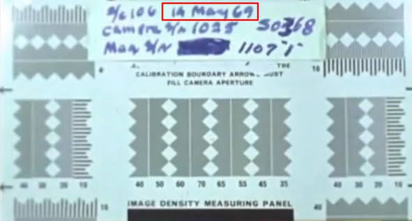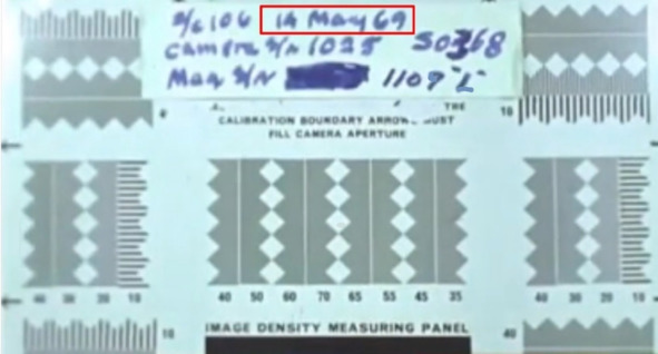 Вероятность ошибки указания даты можно теперь смело отмести. Сомнительной выглядит предположение о том, что при выдаче пленки со склада за 4 дня до начала миссии, такую заставку изготавливали специалиста монтажа. Указывать эту дату после завершения изготовления фильма НАСА, как день получения пленки тоже очень сомнительная гипотеза. В титрах, как правило, указывают дату изготовления всего видеоролика. В этом фильме есть и другие кадры с датой: 14 мая 1969 год.