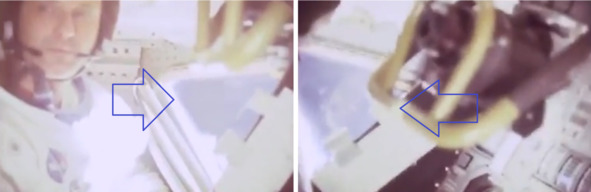 В самолете нулевой гравитации при образовании состоянии невесомости существуют промежуточные состояния малой гравитации. В этот момент предметы будут медленно опускаться вниз, при возникновении полной невесомости предмет, достигнув опоры, ударяется и резко начинает движение вверх. В самолете нулевой гравитации по этой причине тела, предметы, провода начинают плавные колебания вверх вниз. В фильме НАСА, при демонстрации сцен невесомости такие моменты тоже присутствуют. Есть сюжеты с колебанием тела «космонавта», присутствует суетливость при захвате предметов, парящих в пространстве. Актеры боялись, что они не успеют поймать предмет в состоянии невесомости, в специальном самолете. В этом случае вся сцена пойдет насмарку. При возникновении перегрузки эти предметы будут резко опускаться вниз и останутся лежать на полу кабины. В этой связи, необходимо обратить внимание на самопроизвольные колебания, например, связки проводов, которая почему-то опускалась то вверх, то вниз. В кадрах «1:02:57» и «1:02:59», когда американский космонавт брился в состоянии невесомости, эти провода без постороннего влияния начинали странные колебания то вверх то вниз. Сцена замечательна тем, что на этих кадрах показано, как солнечные лучи освещают глаза американского «космонавта». Он не боится яркого солнечного света и за свои глаза, находясь в американском «космосе». В этот же момент в иллюминаторе наблюдается яркое голубое небо.