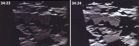Демонстрация резкого изменения освещенности поверхности «Луны». Кадры «34:23» и «34:24». В кадре один и тот же участок «Луны», освещенность которого резко изменилось за одно мгновение. В киностудии НАСА, по всей видимости, существовала система регулировки яркости освещения глобуса Луны, макетов поверхности. Осветители резко изменили освещенность поверхности киноплощадки или «песочницы» НАСА. Поэтому резко изменилось изображение освещенности американской «Луны» в кадре «34:24». Следует отметить еще один характерный момент этих видеоматериалов, которые показали эпизоды состояния невесомости. Кадры с подобной демонстрацией отсутствия гравитации длятся не более 50—40 секунд и в фильме присутствуют очевидные следы монтажа. Одна сцена демонстрации резко прекращается, начинается другая сцена. Вероятно, что опытных специалистов по монтажу и комбинированным съемкам в тот период в системе НАСА не было.