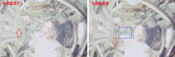 Если бы эта ситуация происходила в реальном космосе, в иллюминаторе было бы видно черное небо, а «космонавт» не стал бы так легкомысленно смотреть на Солнце. В этом фильме американские обманщики использовали систему подвесов, которая позволяло «космонавту» длительное время висеть вниз головой, когда другой «космонавт» демонстрировал свое положение в пространстве в нормальном состоянии. При этом, «космонавт», который висел вниз головой, не показывал свои ноги, размахивал руками, извивался, отталкивался руками от стен кабины и почему то не смещался при этом в сторону. Это признак того, что «космонавт» прикрепил свои ноги к потолку в специальные крепления. Благодаря такому трюку, на моменте демонстрации до кадра «1:10:57», «космонавт» мог продемонстрировать такое зависание, и значит, сцену невесомости более длительное время. После этого эпизода оператор с изображения двух фигур повернул камеру на третьего члена экипажа. Создается впечатление, что в кабине «КМ» «Аполлон-10», находился четвертый «космонавт».
