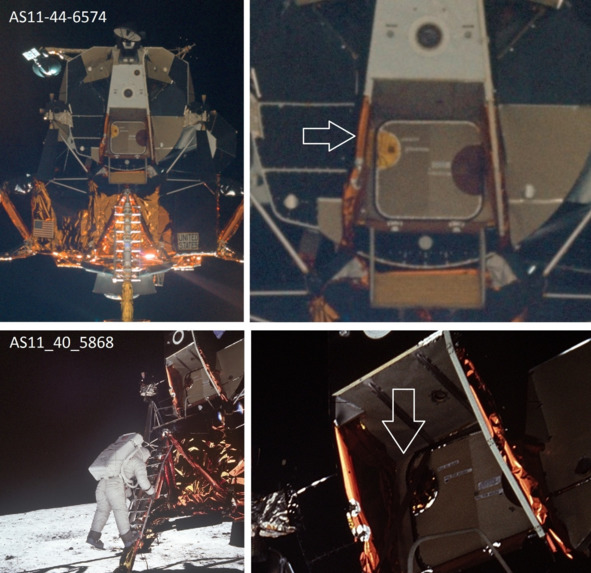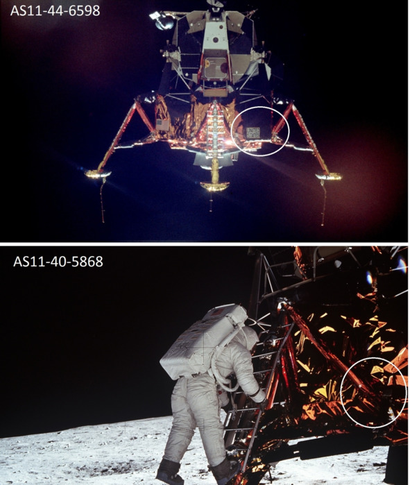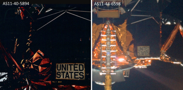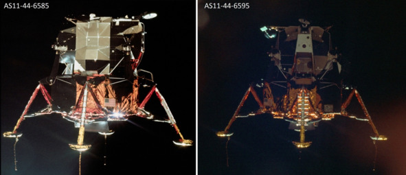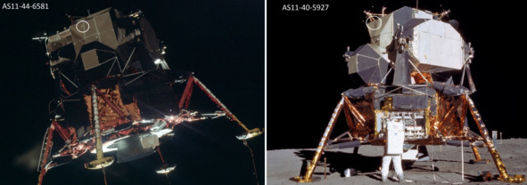Подпись к фотографии слева: «AS11-44-6585 (20 июля 1969 г) – Лунный модуль Аполлона-11 (LM)» [8] Описание фотографии НАСА, справа: «AS11-44-6595 (20 июля 1969 г.)». [9]