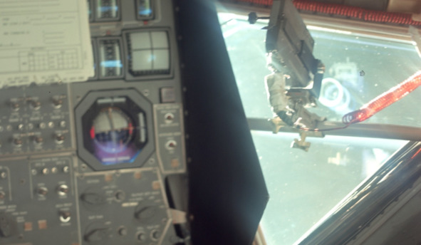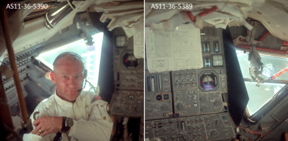 Аннотация к фотографии 5390: «AS11-36-5390 (20 июля 1969 г.) – На этом внутреннем виде лунного модуля Аполлона-11 (LM) изображен астронавт Эдвин Э. Олдрин-младший, пилот лунного модуля, во время полета на Луну. Снимок сделал астронавт Нил А. Армстронг, командир». [6] Предыдущий снимок с номером 5389 безусловно был выполнен в этот же день. [7] На этом эпизоде странности фотографий НАСА не заканчиваются. Американские фальсификаторы решили показать ЛМ в космическом пространстве. При этом обманщики допустили очевидные ошибки. «Лунный модуль» в «космосе» изменился.