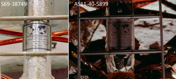 Подпись под фотографией с табличкой из студии, слева: «S69—38749 (июль 1969 г.) – Крупный план мемориальной доски, которую астронавты „Аполлона-11“ оставят на Луне в ознаменование исторического события. Табличка сделана из нержавеющей стали размером девять на семь и пять восьмых дюймов и толщиной одна шестнадцатая. Доска будет прикреплена к трапу на стойке шасси на спускаемой ступени лунного модуля Apollo 11 (LM)». [4] Фотография справа: «AS11-40-5899 (20 июля 1969 г.) – Крупный план мемориальной доски, которую астронавты Аполлона-11 оставили на Луне в ознаменование исторической миссии по высадке на Луну. Бляшка была прикреплена к трапу на стойке шасси на спускаемой ступени лунного модуля (LM) Apollo 11». [5] Теперь все готово к «лунным» съемкам!