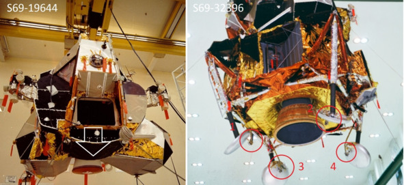 Фотография НАСА, слева: «S69—19644 (4 января 1969 г.) – этап подъема лунного модуля (LM) 5 в зоне окончательной сборки на подвесном подъемнике перемещается на тележку для проверки выкатывания». [10] Сопло ЖРД светлое, без чехла. Фотография НАСА, справа: «S69—32396 (4 апреля 1969 г.) – Внутренний вид здания пилотируемого космического корабля Космического центра Кеннеди (KSC), показывающий, что лунный модуль (LM) 5 перемещается с рабочего стенда для стыковки с его адаптером лунного модуля космического корабля (SLA)». [11] На пятах стойки 4 щупа. В «космосе» США наблюдается три таких объекта. В сборочном цехе, на этих же местах, фигурировало 4 щупа. Сопло ЖРД в «космосе» темное, в сборочном цехе сопло светлое.