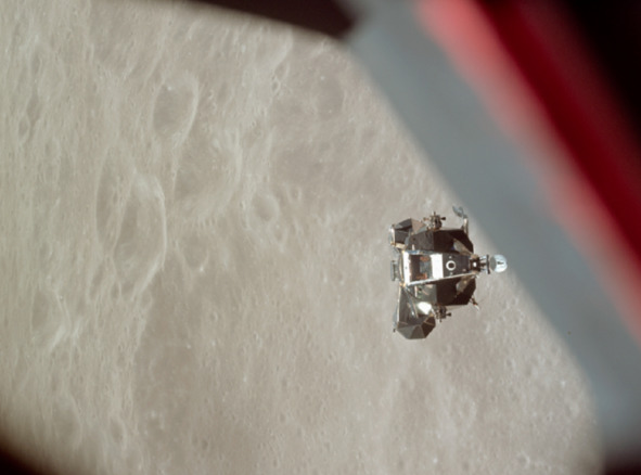 Подпись к фотографии НАСА: «AS10-34-5112 (26 мая 1969 г.) Стадия подъема лунного модуля „Apollo 10“ (LM) фотографируется с командного модуля до стыковки на лунной орбите. LM приближается к командным и сервисным модулям снизу. Стадия спуска ЛМ уже была отброшена. Поверхность Луны на заднем плане близка, но за восточной частью Луны, если смотреть с Земли (около 120 градусов восточной долготы). Красная и синяя диагональные линии, это край окна космического корабля». [14] В реальном космосе, когда поверхность Луны расположена от фотографа на расстоянии нескольких десятков километров, а сам «космический аппарат» на расстоянии десятков метров, такое изображение получить невозможно. Резкость близкого к фотографу части иллюминатора сильно отличается от резкости изображения «ЛМ» и поверхности «Луны». Фокус фотоаппарата настроен на фотографирование объектов, на расстояние, которое имелось между фотографом и «ЛМ». Тогда получается, что «лунная поверхность» находится сразу же за этим аппаратом!