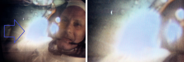 Но в данном эпизоде съемка, опять же, согласно сказкам НАСА, велась в кабине аппарата, наполненной кислородом. В этой ситуации можно оправдаться. Если есть атмосфера, даже с атмосферным давлением 0,3 атмосферы, значит, есть возможность образования конденсата, капель жидкой воды. Они проявляются на линзе при боковом освещении светом.