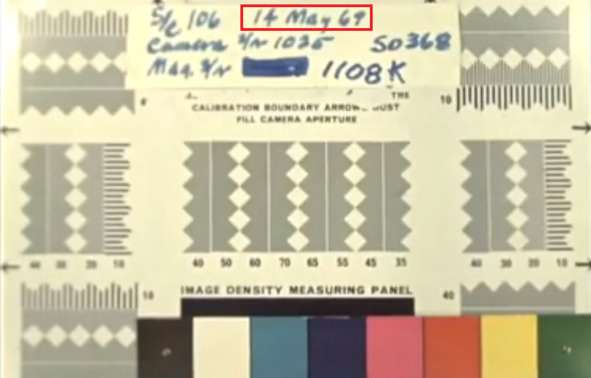 Необходимо также отметить, что указанные «дефекты» в отличии от реальных дефектов пленки имеют длительное время демонстрации и стабильное положение относительно «ступени». Это свидетельствует о том, что данные блики вызваны другими причинами, а не качеством пленки фильма. Защитники НАСА всегда находят оправдания по таким необычным явлениям на пленках видео материалов: плохой качество кадров, результат пересъемки и оцифровки. Но на этих кадрах есть другие необычные признаки обмана. В этом фильме встречаются еще одна заставка с указанием даты «14 мая 1969 год». Если нумерация пленки ранее была «1108 К», то в этой заставке указан номер пленки «1109 I». Заставка сделана до того, как был осуществлен сам «полет»? Опять допущена ошибка в указании даты изготовления фильма? Можно ли было на пленке делать такие заставки в ее начале, при выдаче пленки со склада?
