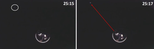 В последующих кадрах, включая кадр «25:15», верхняя светлая точка начинает синхронно передвигаться влево вверх вместе с макетом ступени. Этот странный «дефект» пленки или «светлячок» имени Джона Гленна ведет себя необычно. Он напоминает больше блик на тонком тросике, который тянет макет в указанном направлении. На кадре «25:15» это направление движения показано стрелкой красного цвета. Макет ступени в киностудии НАСА, чтобы исключить проявление в кадре его самопроизвольного вращения или раскачивания, должен был быть обеспечен несколькими подвесами. Это должны быть тонкие тросики, как подвесы, лонжи, так и боковыми креплениями, расположенными под углом к вертикальной линии.