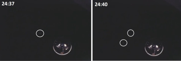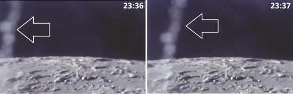 Впрочем, возможно, это было изображение крепления макета КМ, которое случайно попало в кадр. Если это было так, то расплывчатое изображение этого объекта объясняется близостью его к фотокамере. Макеты космических аппаратов, которые снимали в киностудии НАСА, передвигали с помощью тонких струн, вероятно, покрашенных в черный цвет фона. При этом на этих подвесах при неправильном боковом освещении могли возникать блики. Такие кадры в фильме про «Аполлон» встречаются, где возникают странные «дефекты» кадров, сильно напоминающие отражение света на поверхности подвеса для макета НАСА. На следующих кадрах «24:14» и «24:15» эти небольшие «дефекты» в виде «тире» отмечены белыми окружностями. Самый большой «дефект» кадра, который присутствует на всех трех изображениях, очевидно, каким-то образом связан с объектом внизу. Этот блик перемещается с изображением «ступени» синхронно. Если бы это был реальный дефект пленки, такого согласованного смещения не было бы. В процессе демонстрации эти «дефекты» становятся сначала яркими, а потом бледными точками. «Чудеса» будут происходить и в других миссиях.