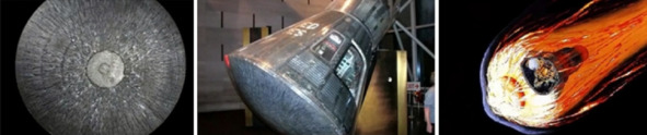 Таким образом, набегающий воздух, теряя свою скорость перед телом, нагревается на v²/2000 °С» [48] Итогом расчета Оберта был следующий результат: «Таким образом, искомая температура значительно превышает для ракет 5000°. Если же необходимо предотвратить такое сильное нагревание поверхности, следует подвести достаточное количество охлаждающего вещества, чтобы оно могло отнять тепло Q»… При скорости 10 000 м/сек эта температура, безусловно, превышает 15 000°. Вероятно, она даже превышает 20 000°». При температуре 5000°С, плазма даже небольшой плотности не оставит на поверхности теплового экрана, соприкасающегося с плазмой никаких лучеобразных следов, окружностей, заклепок, любых геометрических фигур и надписей. К этому надо прибавить образование копоти, аэродинамический ветровой напор. После таких испытаний тепловой экран не может выглядеть так, как это было показано американцами на примере капсулы «Меркурий». Оберт не добавил в своей книге сведений об образовании ударных волн, в разряженной атмосфере, при спуске с орбиты. Видимо он просто не знал об этом. Если полет совершается со сверхзвуковой скоростью, торможение в атмосфере приводит к образованию ударной волны, возникающей перед телом: «С повышением скорости полёта температура воздуха за ударной волной и в пограничном слое возрастает, в результате чего происходит диссоциация и ионизация молекул. Образующиеся при этом атомы, ионы и электроны диффундируют в более холодную область – к поверхности тела. Там происходит обратная реакция (рекомбинация), идущая с выделением тепла. Это даёт дополнительный вклад в конвективный Аэродинамический нагрев. При достижении скорости полёта порядка 5000 м/сек, температура за ударной волной достигает значений, при которых газ начинает излучать. Вследствие лучистого переноса энергии из областей с повышенной температурой к поверхности тела происходит радиационный нагрев. При этом наибольшую роль играет излучение в видимой и ультрафиолетовой областях спектра. При полёте в атмосфере Земли со скоростями ниже первой космической (8,1 км/сек) радиационный нагрев мал по сравнению с конвективным. При второй космической скорости (11,2 км/сек) их значения становятся близкими, а при скоростях полёта 13—15 км/сек и выше, соответствующих возвращению на Землю, основной вклад вносит уже радиационный нагрев.