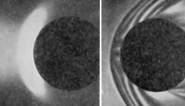 Частным случаем аэродинамического нагрева является нагрев тел, движущихся в верхних слоях атмосферы, где режим обтекания является свободномолекулярным, т. е. длина свободного пробега молекул воздуха соизмерима или даже превышает размеры тела. Особо важную роль аэродинамического нагрева играет при возвращении в атмосферу Земли космических аппаратов (например, «Восток», «Восход», «Союз»). Для борьбы с А. н. космические аппараты оснащаются специальными системами теплозащиты» [49] [50] [51]. Расчеты Гербета Оберта имеют приблизительный, прикидочный характер. Новые компьютерные программы расчета температуры плазмы при аэродинамическом нагреве позволяют получать более точные величины. Но принципиально этот результат компьютерной методики расчета не отличается от результата немецкого ученого. Температура плазмы 5000°-8000°С и больше это не преувеличение. В разряженной Атмосфере ударная волна образуется в районе теплового экрана космического корабля. В плотных слоях атмосферы скорость уменьшается, при этом идет образование ударных волн полосками на боковой поверхности объекта, капсулы. В ударной волне возникает резкий скачок температуры и плотности плазмы.